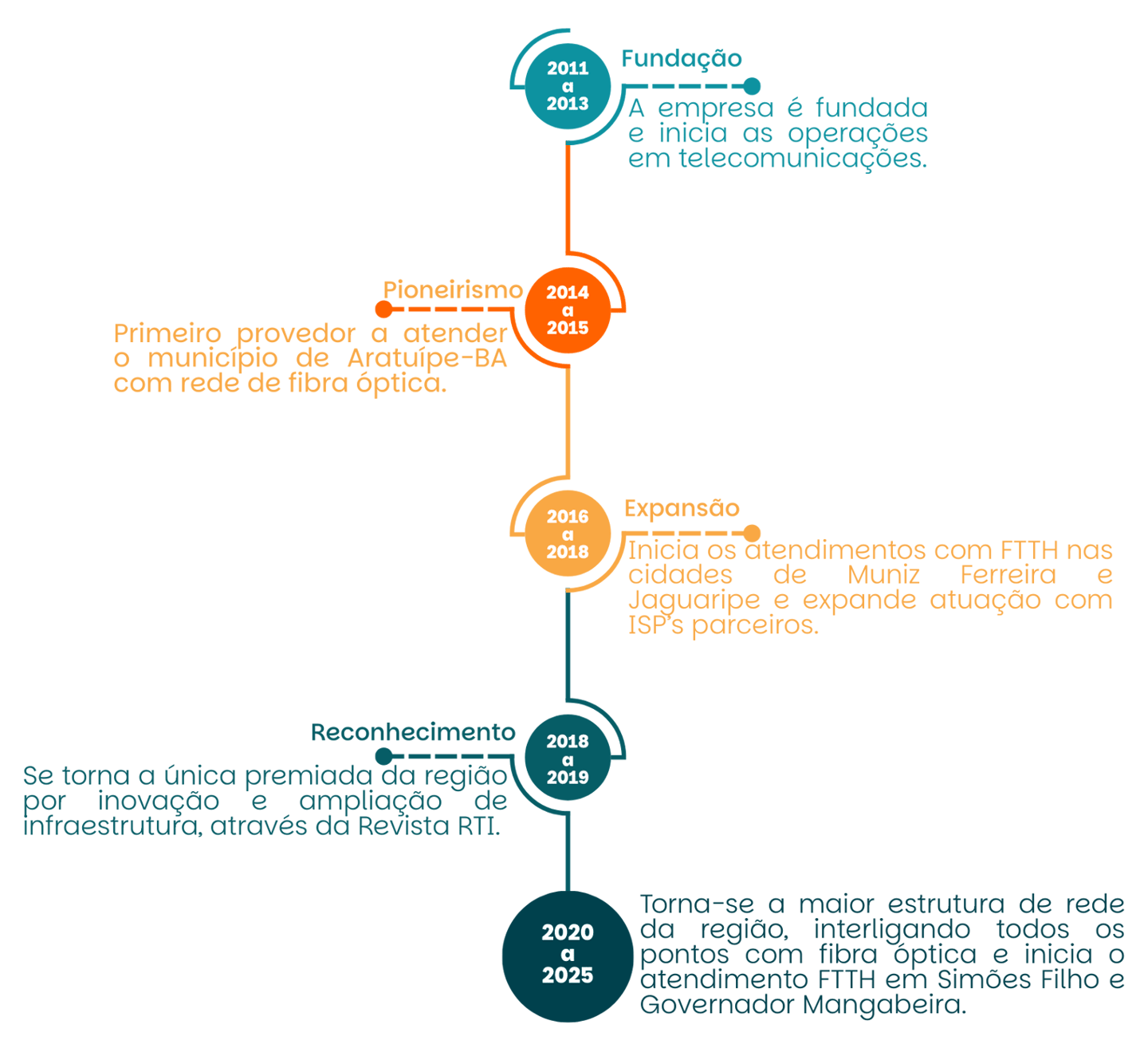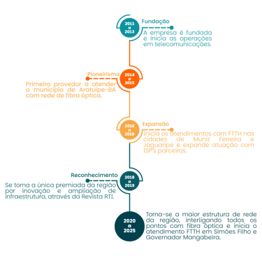 Somos uma empresa baiana de tecnologia e conectividade, fundada em 2011 na cidade de Nazaré – Bahia. Atuamos no fornecimento de soluções em internet por fibra óptica, atendendo residências, empresas e instituições públicas em diferentes municípios do Recôncavo Baiano. Com uma infraestrutura em constante expansão e uma equipe comprometida, consolidamo-nos como uma das principais provedoras da região, reconhecida pela inovação, confiabilidade e responsabilidade social, por meio de soluções integradas, diversificadas e completas.